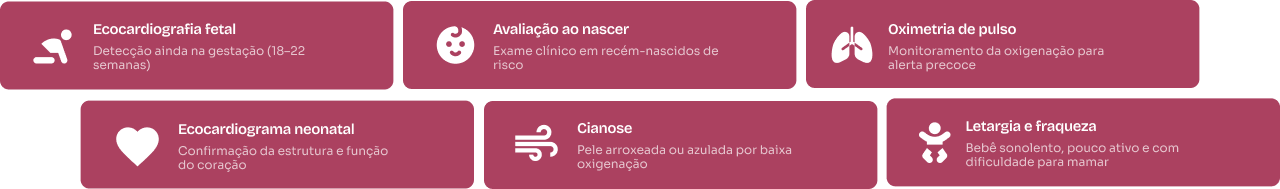 Os sintomas geralmente aparecem nas primeiras 24 a 48 horas de vida, quando o canal arterial começa a se fechar. Os sinais incluem cianose (pele azulada), respiração rápida, fraqueza, dificuldade para mamar e letargia. Procure atendimento imediato se esses sinais surgirem.